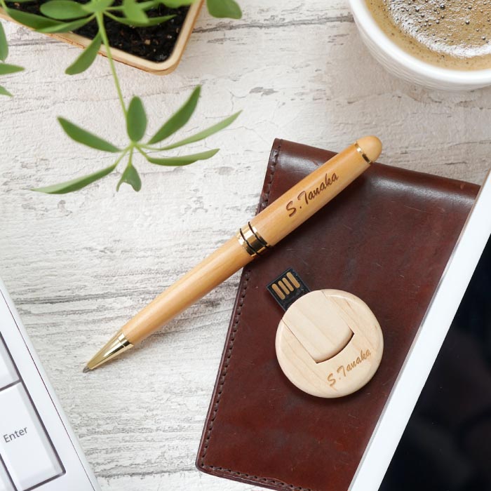 ずっと大切に使いたい、木製オリジナルボールペン と 木製USBメモリ の2点セットは 男性、女性を問わず、卒業祝い、就職祝いの贈り物にぴったり! お世話になった上司の栄転、昇進のお祝いや、送別の贈り物 いつも仕事をがんばっている、お父さん、お母さんにも!! 創立記念品、創業記念、周年記念品、入学祝い、卒業記念品 合格祝い、退職祝い、入社祝い、送別会、送別品、歓迎会 定年退職、定年退職祝い、還暦祝い、長寿祝い 誕生日、記念日、父の日、母の日、敬老の日、などのギフトにも◎ 旦那様への結婚記念日や、木婚式のプレゼントにも! 名前を入れて世界に一つのプレゼント! 仕様 / サイズ [ボールペン] ■表面材質:木&スチール製 ■サイズ:約145mm/直径:約15mm ■重量:約21g ■カラー:ブラウン/ナチュラル ■付属の芯:COLTEX(型番)Refil C501 サイズ:1.0mm ※この商品は回転式です [USB] ■材質:天然木 ■サイズ:直径約40mm ■容量:8GB ■重さ:約8g ■対応OS(動作確認) インターフェイス:USB2.0対応 Windows シリーズ(10・8・8.1・7)/ MAC OS 配送方法 宅配便/メール便不可 ※ご注文の際、メール便をご希望の場合は【宅配便】へ変更させていただきます。