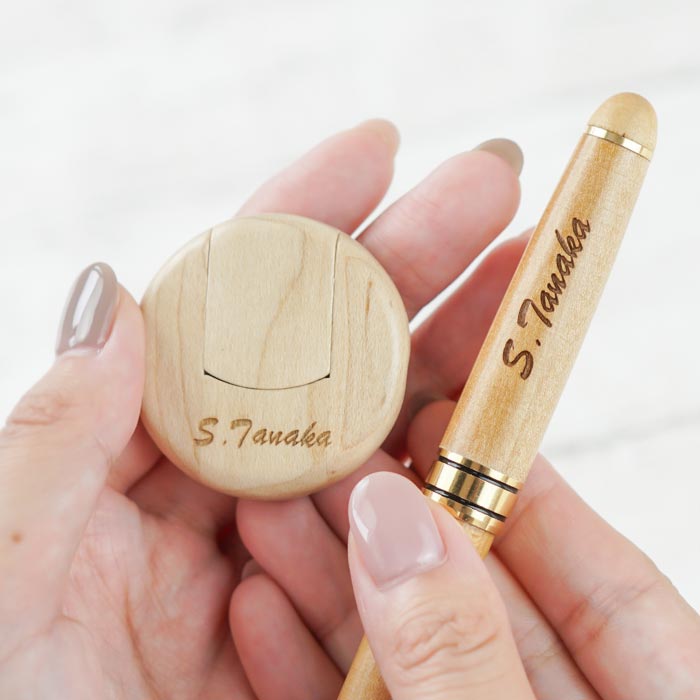 無機質になりがちなデスク周りに木のぬくもりをプラスして USBはうっかりなくしてしまいがちなフタも本体一体型でなくしにくい! ■名入れで、オリジナルの特別なプレゼントに。