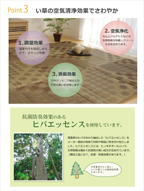 【商品特徴】小さなサークルを沢山ちりばめたデザインのい草ラグです。