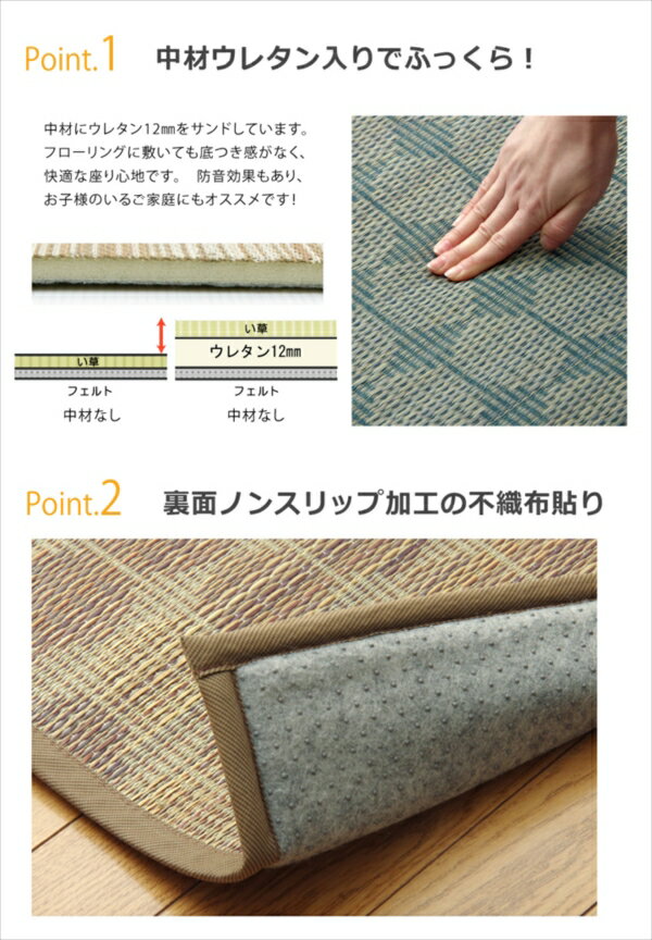 【サイズ】約200×200cm(2.6畳) 【素材】表地=い草 中材=ウレタンフォーム12mm 裏地=ポリエステル100%(不織布) ※滑りにくい加工※普通織 ヘリ=ポリエステル80%、綿20%洗えません。