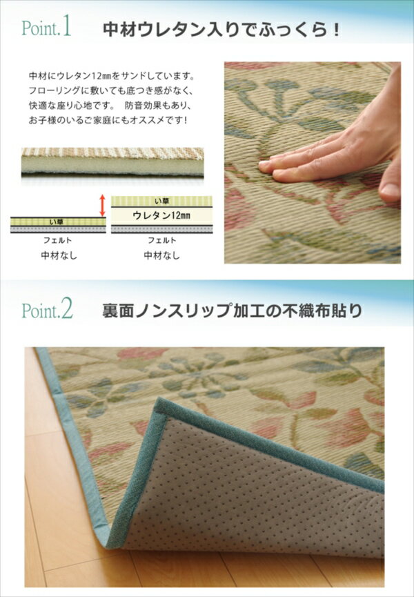 【サイズ】約200×200cm(2.6畳) 【素材】表地=い草 中材=ウレタンフォーム12mm 裏地=ポリプロピレン100%(不織布) ※滑りにくい加工※普通織 ヘリ=ポリエステル80%、綿20%洗えません。