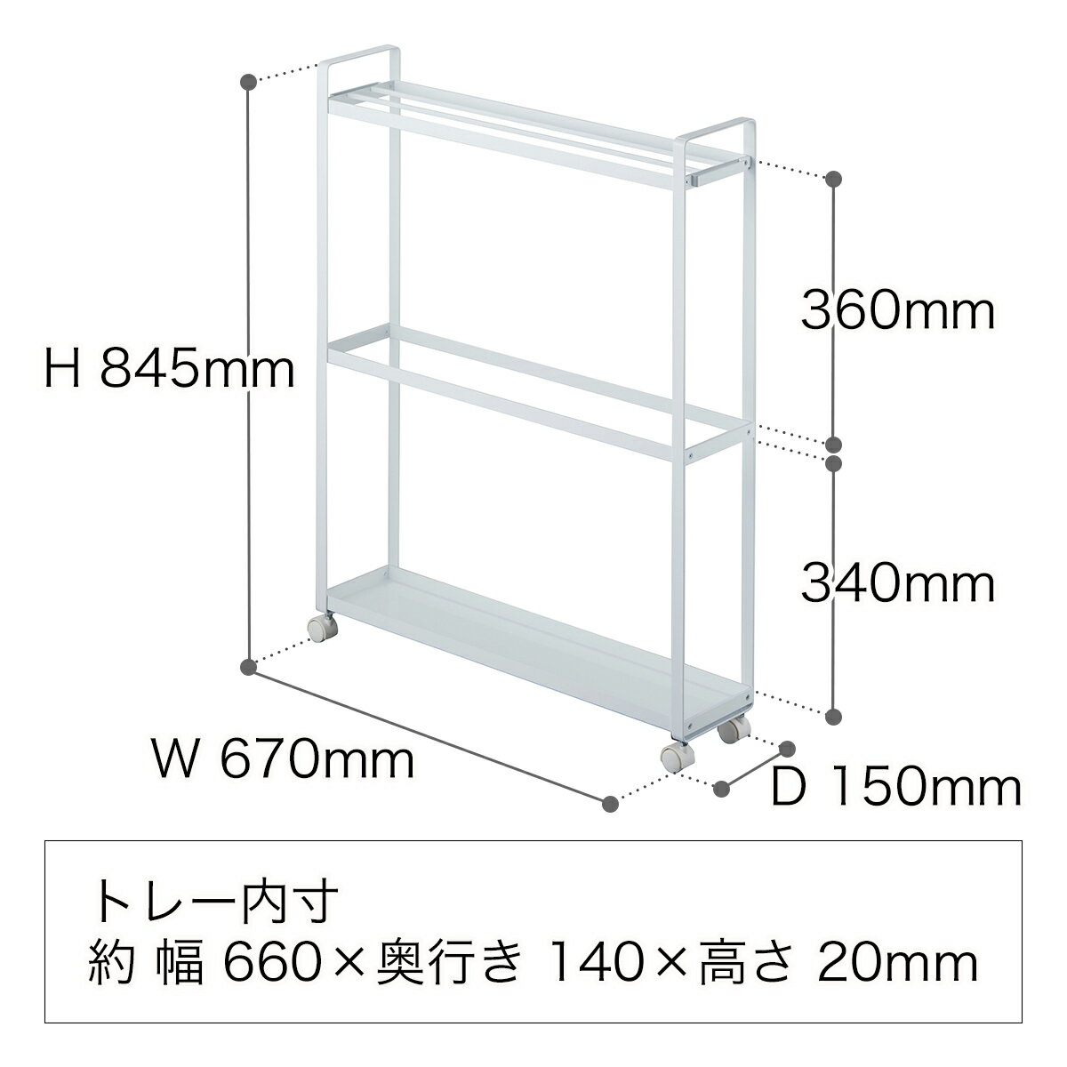 品番 4292 / 4293 サイズ 約 幅 670mm×奥行き 150mm×高さ 845mm トレー内寸:約 幅 660mm×奥行き 140mm×高さ 20mm 重さ 約 4.2kg 素材 本体:スチール( 粉体塗装 ) キャスター:ナイロン樹脂 耐荷重 上段、中段ハンガー部:各 約 500g トレー:約 4kg フック:約 250g( 1つあたり ) 付属品 六角レンチ、スパナ、フック×2 ご注意 ※サイズは個体により若干の差異がある場合があります。